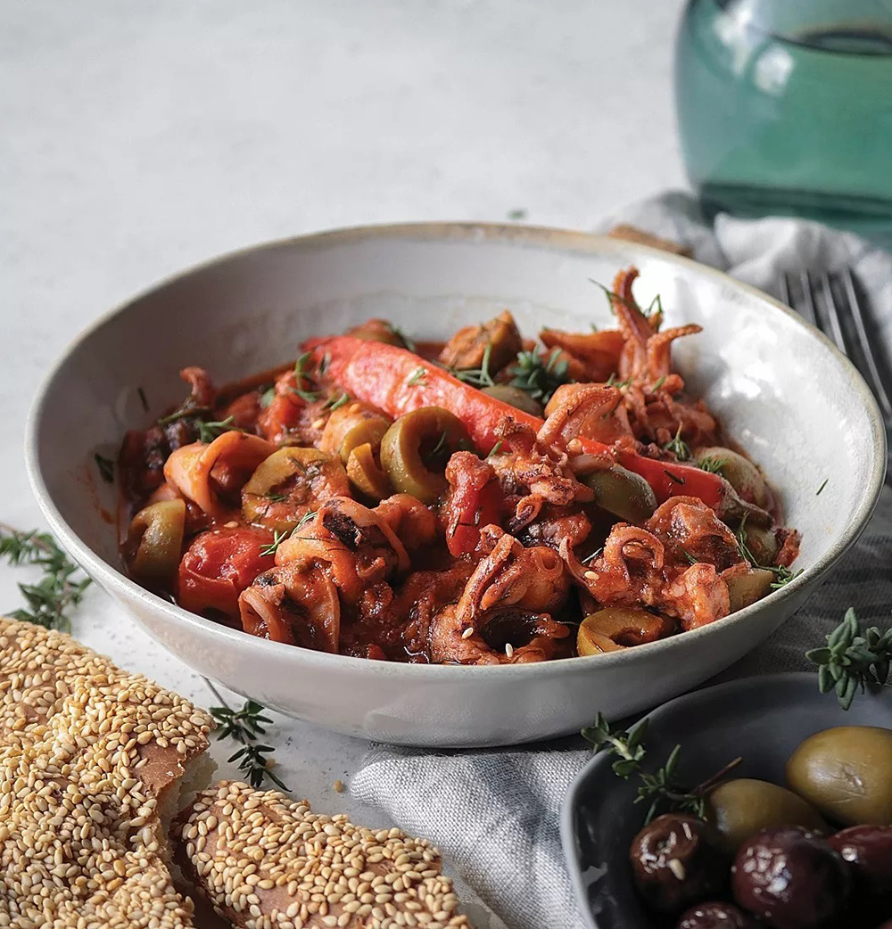 Δίνουμε σε αυτά τα καλαμαράκια έναν πικάντικο τόνο προσθέτοντας μπούκοβο, αλλά και ιδιαίτερη γεύση, με τις πράσινες ελιές που μπαίνουν στην κατσαρόλα λίγο πριν το τέλος του μαγειρέματος.