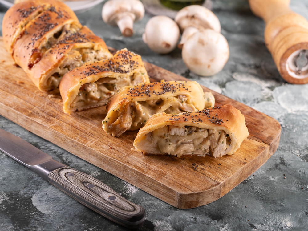 Στρόμπολι με ζουμερό φιλέτο κοτόπουλο, σωταρισμένα μανιτάρια και λιωμένα τυριά που λιώνουν στο στόμα. Ο chef Γιώργος Τσούλης σας ετοιμάζει μια ροδοψημένη ζύμη ιδανική για τραπέζι με φίλους και γεύση από Ιταλία!