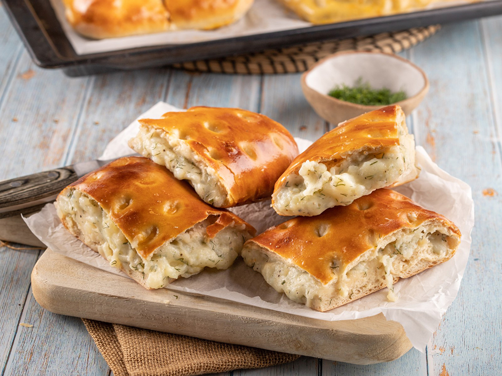 Αλείφουμε τις πίτες με τους κρόκους αυγού και πιέζουμε με τα δάχτυλα το ζυμάρι από πάνω, ώστε να δημιουργήσουμε τρύπες. Ψήνουμε στον φούρνο για 25 λεπτά.