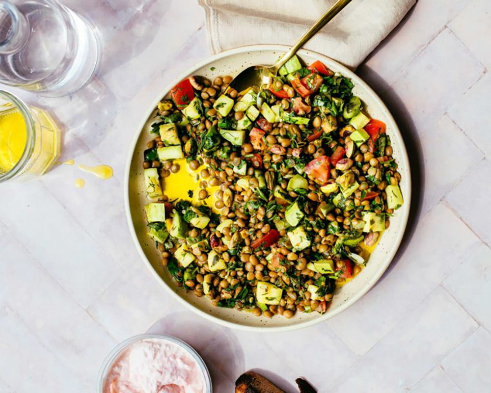 Μια πλούσια και αρωματική οσπριοσαλάτα με φακές και τρυφερά κολοκυθάκια. Οι ξηροί καρποί και τα μυρωδικά μπορούν να αλλάξουν κατά τα γούστα μας: αντί για φυστίκια Αιγίνης να βάλουμε αμύγδαλα, κουκουνάρια ή φουντούκια και αντί για κόλιανδρο, μαϊντανό, άνηθο ή δυόσμο.