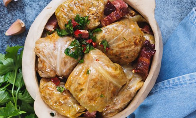 Κόβουµε το κοτσάνι του λάχανου, και το ζεµατίζουµε σε αλατισµένο νερό, ώστε να χωρίσουµε τα φύλλα, αλλά και να µαλακώσουν αυτά ώστε να τυλίγονται. Στο µεταξύ σοτάρουµε στο ελαιόλαδο το κρεµµύδι να γυαλίσει.