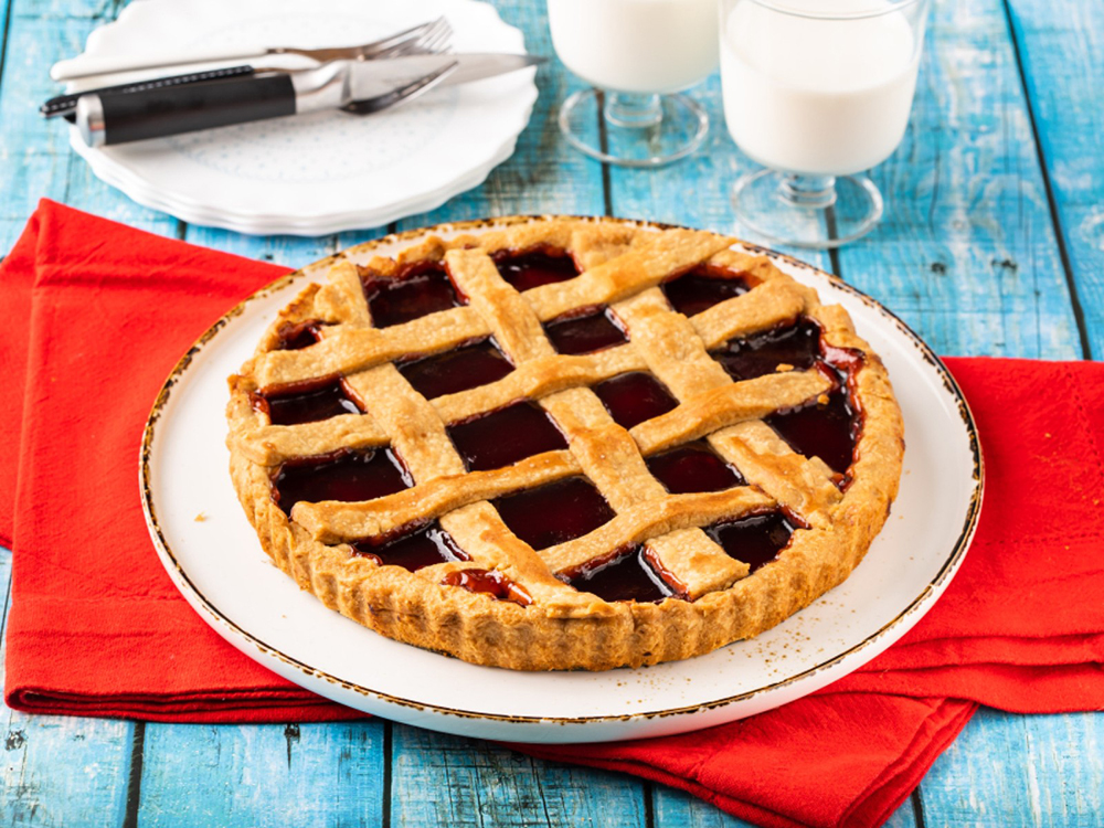 Αλείφουμε τις λωρίδες με λίγο γάλα αμυγδάλου και τις τοποθετούμε σταυρωτά και διαγώνια πάνω από τη μαρμελάδα. Προσέχουμε οι άκρες της κάθε λωρίδας να ακουμπάνε στα τοιχώματα της βάσης και τις πιέζουμε λίγο να κολλήσουν.