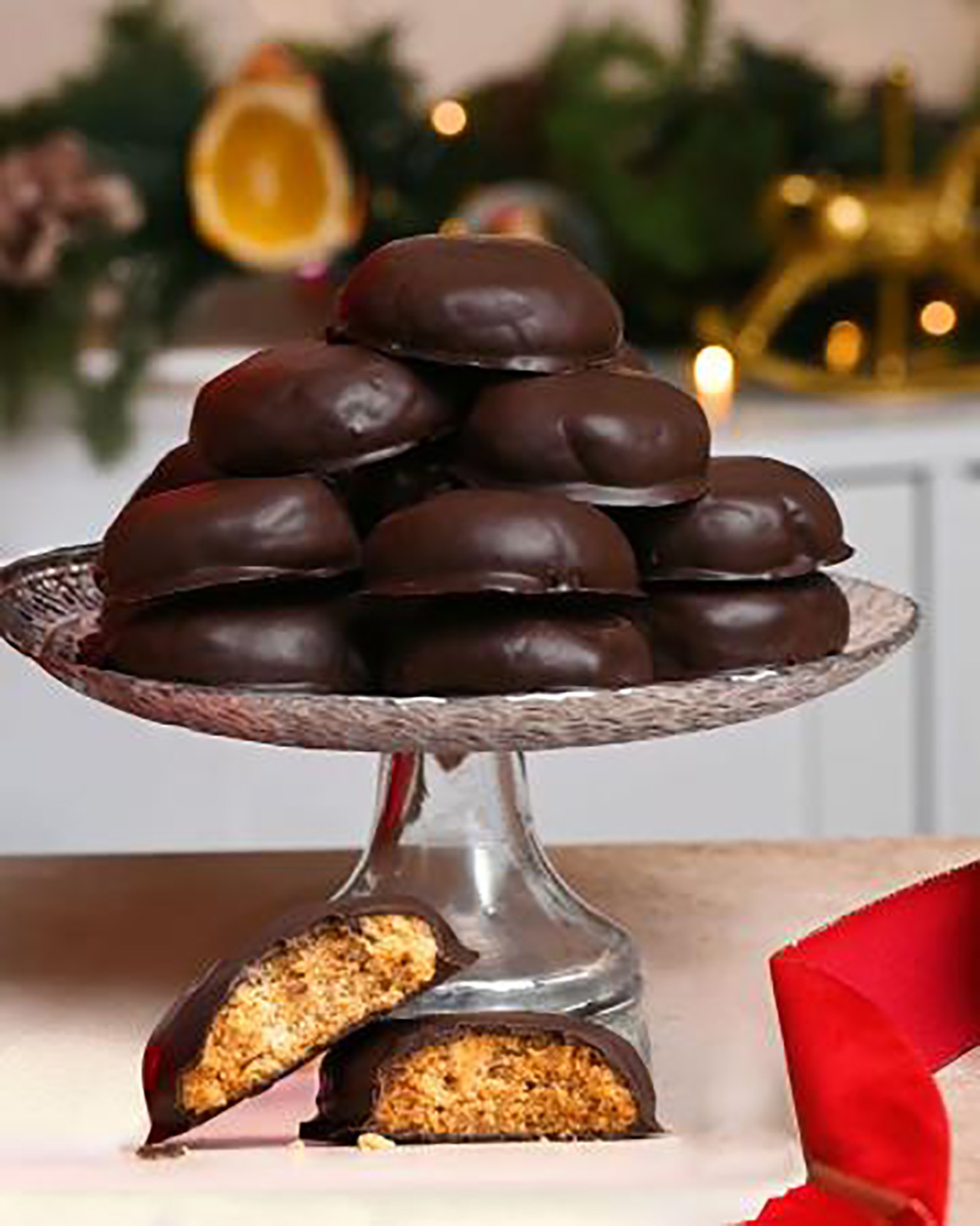 Τους αφήνουμε να στεγνώσουν σε σχάρα και τους σερβίρουμε σε πιατέλα, αφού στεγνώσει και σταθεροποιηθεί η σοκολάτα.