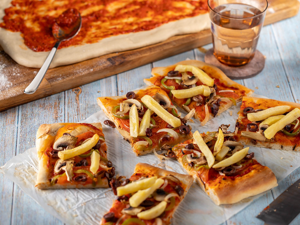 Απλώνουμε τη σάλτσα πίτσας στην επιφάνεια της ζύμης και προσθέτουμε τις ντομάτες, τις πιπεριές, τις ελιές, το κρεμμύδι, τα μανιτάρια και τις πατάτες. Πασπαλίζουμε με τη ρίγανη, ρίχνουμε αλάτι, πιπέρι και ψήνουμε για 10 με 15 λεπτά, μέχρι να χρυσαφίσει η ζύμη. Επαναλαμβάνουμε την ίδια διαδικασία για την υπόλοιπη ζύμη.