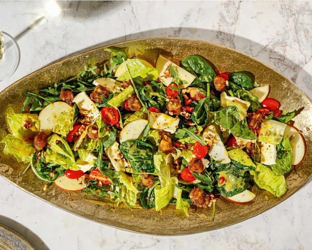 Τα καραμελωμένα κάστανα, το μπρι, οι ξηροί καρποί και το ρόδι κάνουν αυτή τη δροσερή πράσινη σαλάτα έξτρα γιορτινή – η δε γλυκόξινη βινεγκρέτ της πάει πολύ.