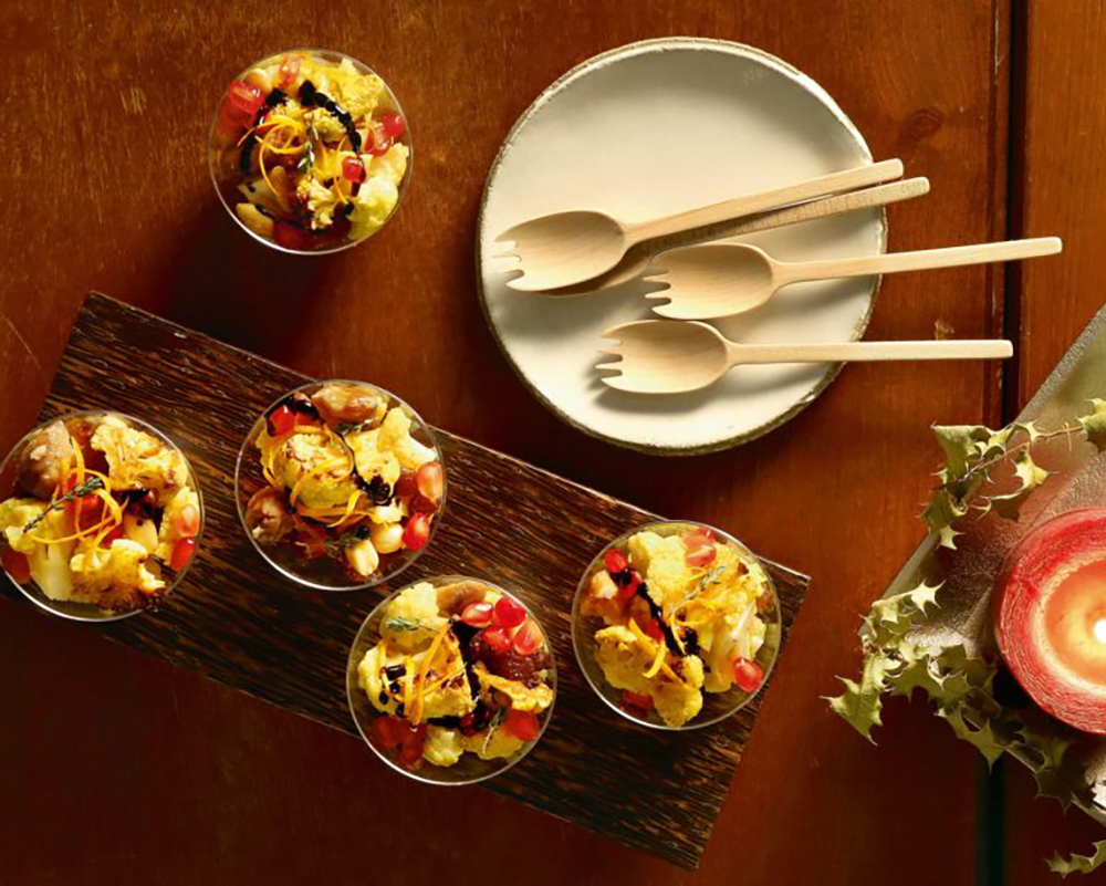 Ως ορεκτικό, πλούσιο συνοδευτικό ή χορταστική σαλάτα σερβίρουμε αυτό το εξαίσιο ψητό κουνουπίδι με κάστανα, αμύγδαλα και ρόδι.