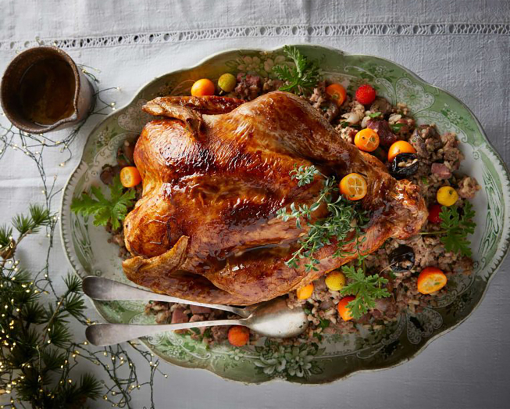 Μια λαχταριστή γαλοπούλα με πλούσια γέμιση -με κάστανα, δαμάσκηνα, κιμά, σύγλινο και τα συκωτάκια του πουλερικού- και μια εξίσου πλούσια σάλτσα με χειμωνιάτικα λαχανικά.