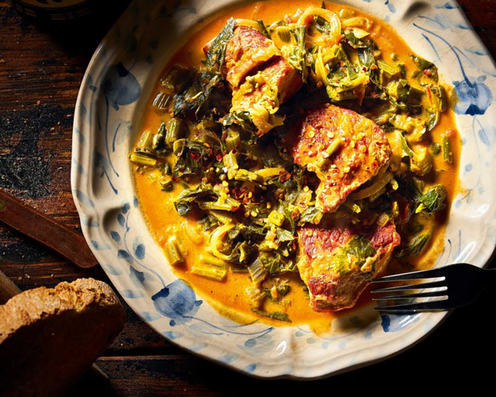 Και αυγολέμονο και σάλτσα ντομάτας έχει αυτό το ιδιαίτερο σελινάτο χοιρινό – είναι μια τακτική που συνηθίζεται στις συνταγές της περιοχής του Ταΰγετου. Το ζουμάκι του είναι στ’ αλήθεια πεντανόστιμο.