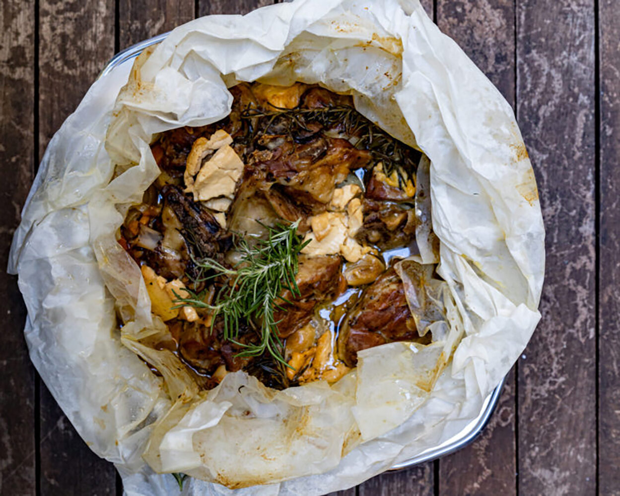 Ξεφουρνίζουμε, ανοίγουμε προσεκτικά το πακέτο μέσα στο ταψί και μεταφέρουμε το κρέας και τα λαχανικά σε μια πιατέλα μαζί με τα υγρά τους.