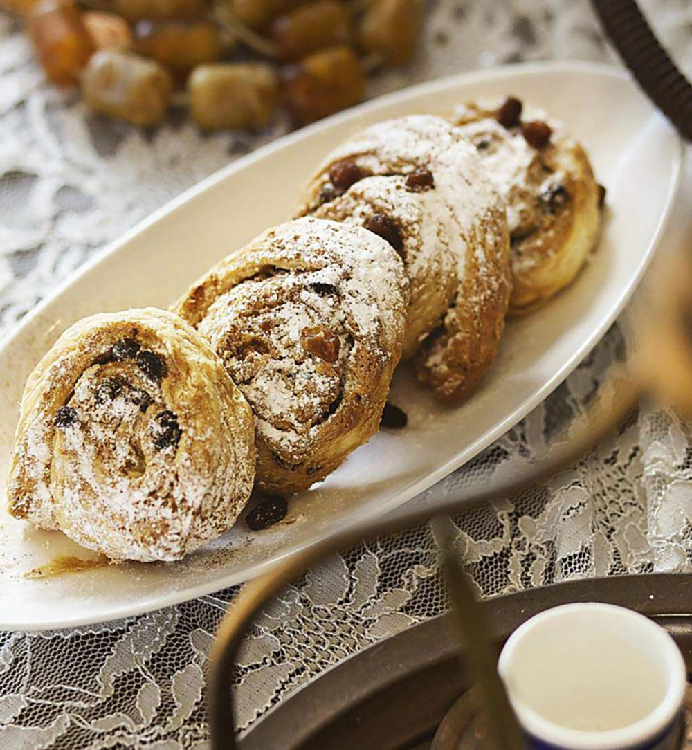 Αφήνουμε το φύλλο να ξεπαγώσει σύμφωνα με τις οδηγίες της συσκευασίας. Ανοίγουμε το φύλλο της σφολιάτας και αλείφουμε με το μισό ταχίνι κάθε φύλλο. Στη συνέχεια, σκορπάμε τις σταφίδες.