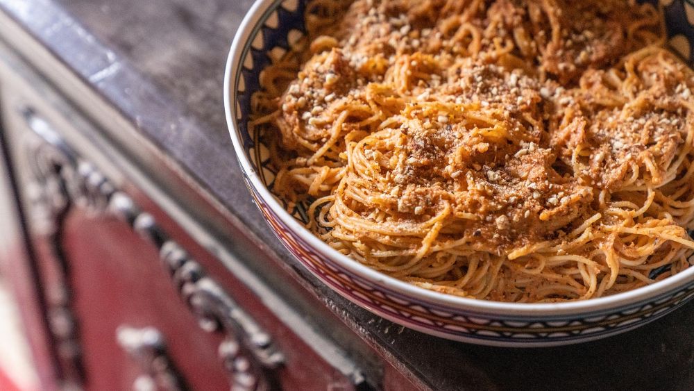 Μια πεντανόστιμη, νηστίσιμη, ξηροκαρπάτη μακαρονάδα από τη μονή του Σινά. Tα αμύγδαλα και τα καρύδια υποκαθιστούν το τυρί, ενώ το κύμινο και η πάπρικα μπορούν να αντικατασταθούν με τα μπαχαρικά της αρεσκείας μας.