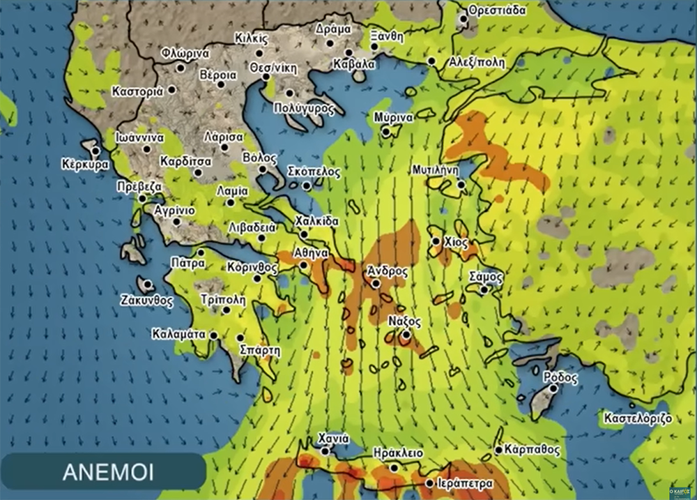 Ανεμοι: Από βόρειες διευθύνσεις 4 με 5 και τοπικά 6 μποφόρ.
