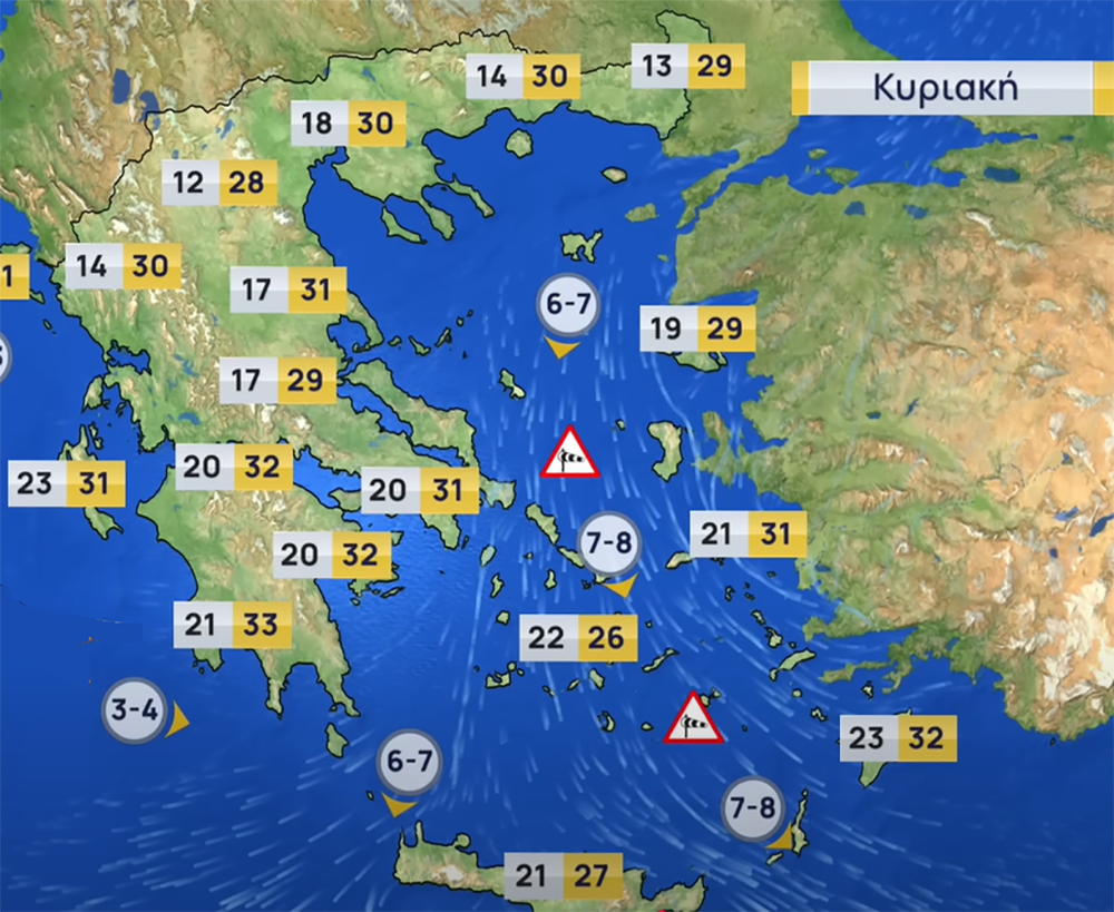 Θερμοκρασία: Από 22 έως 30 και στη νότια Κρήτη τοπικά 33 βαθμούς Κελσίου.