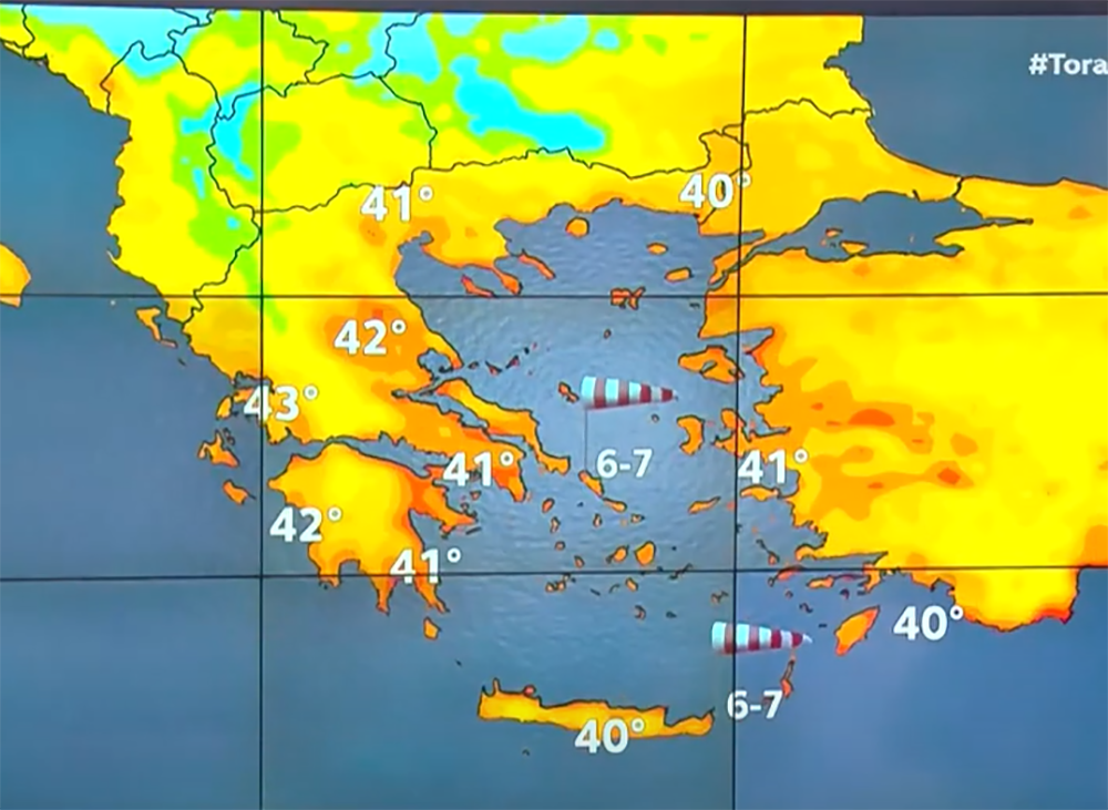Οι θερμοκρασίες στα νησιά θα είναι στους 37°C – 40°C, ενώ στα ηπειρωτικά ο υδράργυρος θα κυμαίνεται στους 41°C – 43°C.