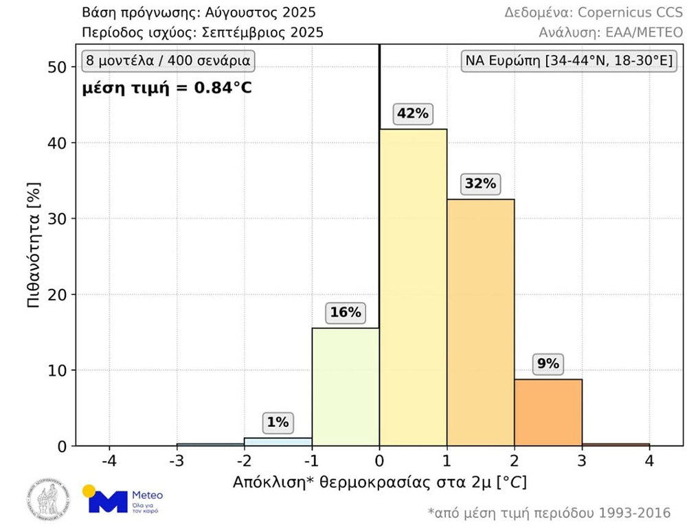 Όπως φαίνεται στο παρακάτω γράφημα, σύμφωνα με το 83% των διαθέσιμων σεναρίων η μέση θερμοκρασία Σεπτεμβρίου θα είναι υψηλότερη από τα κανονικά για την εποχή επίπεδα (περίοδος αναφοράς: 1993-2016).
