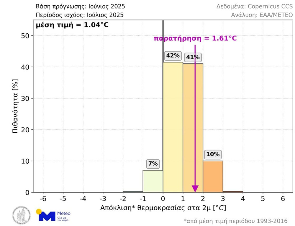 Όσον αφορά τον περασμένο Ιούλιο, η μέση θερμοκρασιακή απόκλιση στη Νοτιοανατολική Ευρώπη ήταν +1.61°C, ενώ η μέση τιμή όλων των σεναρίων της μακροπρόθεσμης πρόγνωσης που εκδόθηκε τον Ιούνιο του 2025 ήταν +1.04°C. Όπως φαίνεται στο παρακάτω γράφημα, το μέγεθος της απόκλισης που παρατηρήθηκε είχε πιθανότητα 41% και ήταν το 2ο πιθανότερο πεδίο τιμών στην μακροπρόθεσμη πρόγνωση.