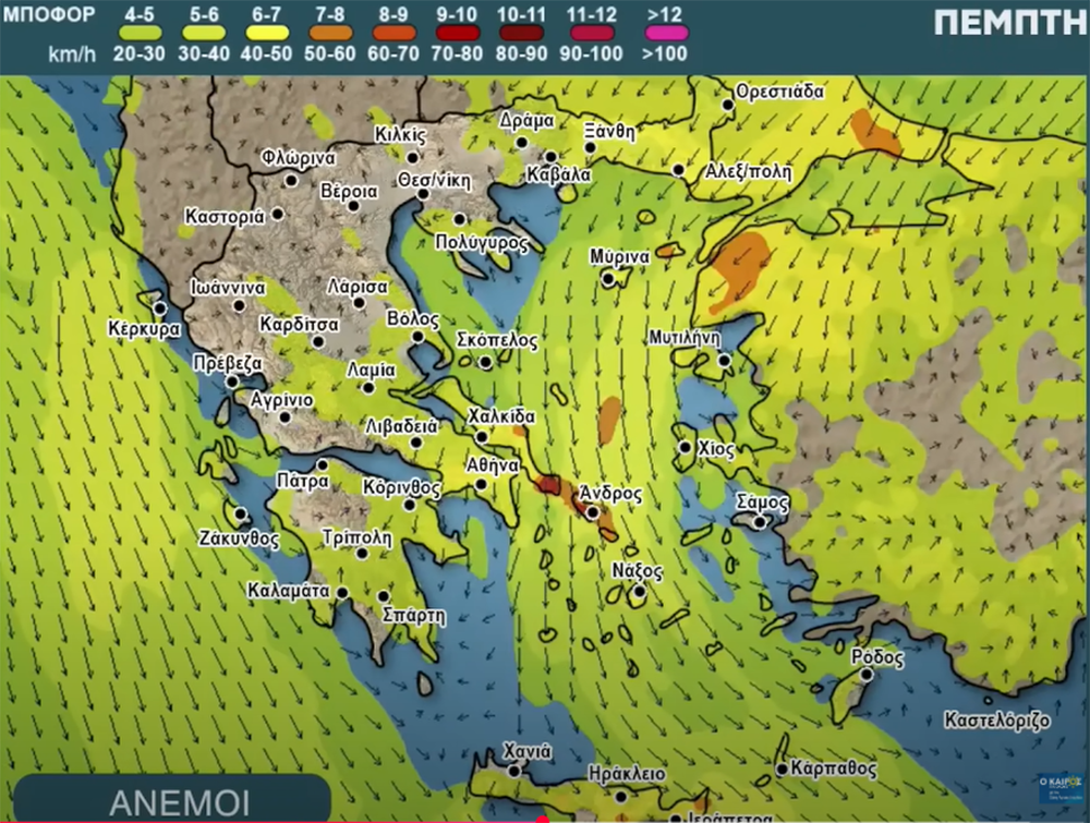 Οι άνεμοι θα πνέουν 5 με 6 μποφόρ και τοπικά στην Κρήτη ριπές 8 μποφόρ την Τρίτη και την Τετάρτη, ενώ την Πέμπτη ενισχύεται περισσότερο ο βοριάς από την Θράκη έως τα νησιά του Νότιου Αιγαίου, και στις Βόρειες Κυκλάδες περιμένουμε 7 με 8 μποφόρ. Και την Παρασκευή θα παραμείνουν βοριάδες και τοπικά ενισχυμένοι στα βόρεια τμήματα των Κυκλάδων και στην Εύβοια.