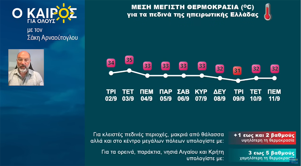 «Ζεστή και σχετικά άνομβρη θα είναι η πρώτη εβδομάδα του Σεπτέμβρη. Σε συνδυασμό και με την πιο ζεστή Θάλασσα αυτή την εποχή ,ο καιρός θα είναι ιδανικός για τα τελευταία μπάνια! Ο υδράργυρος τις επόμενες ημέρες θα βρεθεί 4-6 βαθμούς πάνω από τα κλιματικά δεδομένα της χώρας. Η Τετάρτη 3/9/25 θα είναι η πιο ζεστή ημέρα της εβδομάδας με τον υδράργυρο να φλερτάρει με τους 38 βαθμούς στη Θεσσαλία, τη Φθιώτιδα και τη Βοιωτία και τους 36-37 στην Κρήτη, τα Δωδεκάνησα, την Πελοπόννησο και την κεντρική Μακεδονία. Στην Αττική με τους 35-36 βαθμούς και τους 32-33 στη Θεσσαλονίκη», έγραψε συγκεκριμένα.