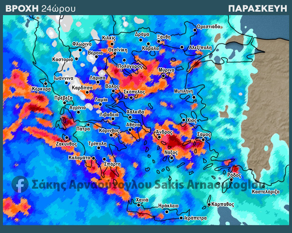 Την Παρασκευή όμως, παρότι σε τμήματα της δυτικής χώρας εξακολουθούν να σημειώνονται αξιόλογες βροχές, οι πιο έντονες αποχρώσεις μετατοπίζονται ανατολικότερα. Αυτό σημαίνει ότι οι περιοχές που επλήγησαν περισσότερο τις προηγούμενες ημέρες δεν φαίνεται να βρίσκονται στο επίκεντρο της έντασης εκείνη την ημέρα, ενώ αυτή τη φορά και άλλες περιοχές της επικράτειας, ακόμη και τμήματα της Κρήτης, ενδέχεται να δεχτούν έντονα επεισόδια βροχών ή καταιγίδων. Χιονοπτωσεις θα σημειωθούν την Παρασκευή σε σχετικά μεγάλα υψόμετρα (ενδεικτικά πάνω απο τα 1700 περίπου μέτρα)