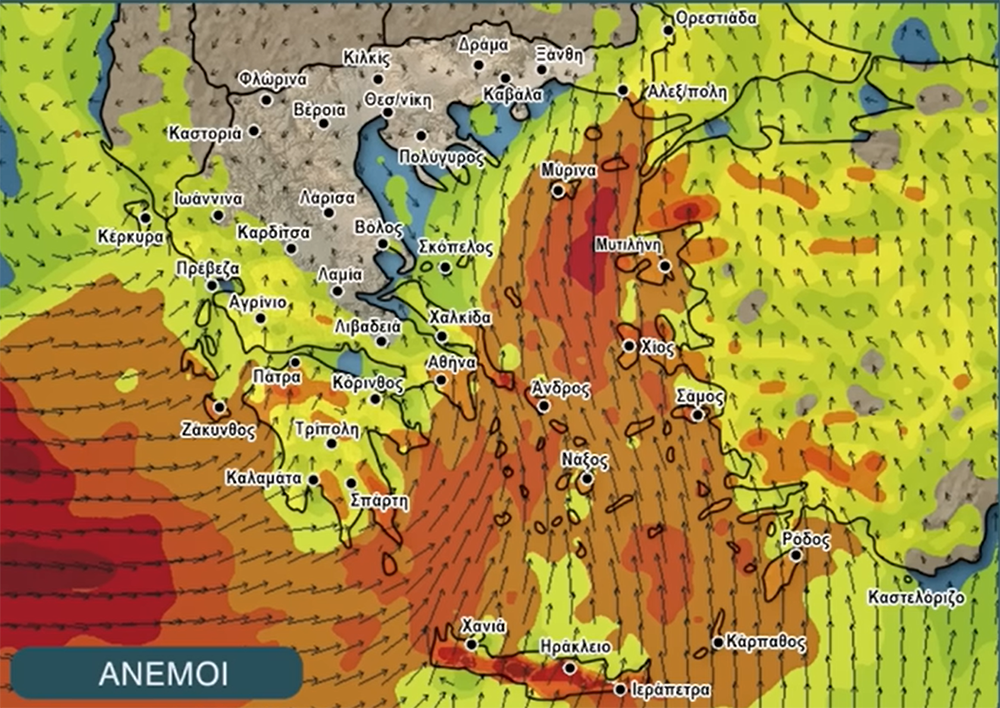 Οι άνεμοι θα πνέουν αρχικά δυτικοί βορειοδυτικοί 4 με 5, στα νότια τοπικά έως 6, στρεφόμενοι γρήγορα στα δυτικά και βαθμιαία στην υπόλοιπη χώρα σε νότιους νοτιοδυτικούς τοπικά στο Αιγαίο 7 μποφόρ.