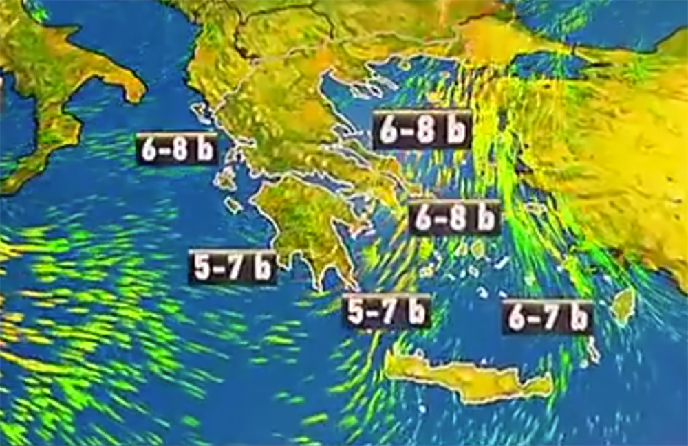 Οι άνεμοι θα πνέουν στα δυτικά δυτικοί βορειοδυτικοί 4 με 5 και βαθμιαία στο Ιόνιο 6, τοπικά 7 μποφόρ. Στα ανατολικά θα πνέουν αρχικά από νότιες διευθύνσεις 5 με 7 στρεφόμενοι γρήγορα από τα βόρεια σε βορείων διευθύνσεων που θα φτάνουν τοπικά στο βόρειο Αιγαίο τα 8 μποφόρ.
