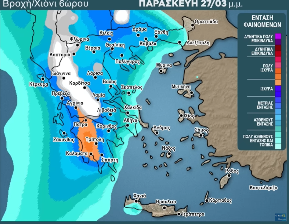 Την Παρασκευή 27 Μαρτίου αναμένεται νέα επιδείνωση στη δυτική, κεντρική και βόρεια Ελλάδα, με αρκετές βροχές, καταιγίδες και πυκνές χιονοπτώσεις ακόμη και σε υψόμετρο από τα 800 έως 1.000 μέτρα. Μέχρι το βράδυ της ίδιας ημέρας, η κακοκαιρία θα επεκταθεί και ανατολικότερα, επηρεάζοντας το σύνολο της ηπειρωτικής χώρας, ενώ στην ανατολική Μακεδονία και τη Θράκη τα φαινόμενα θα είναι κατά τόπους έντονα.