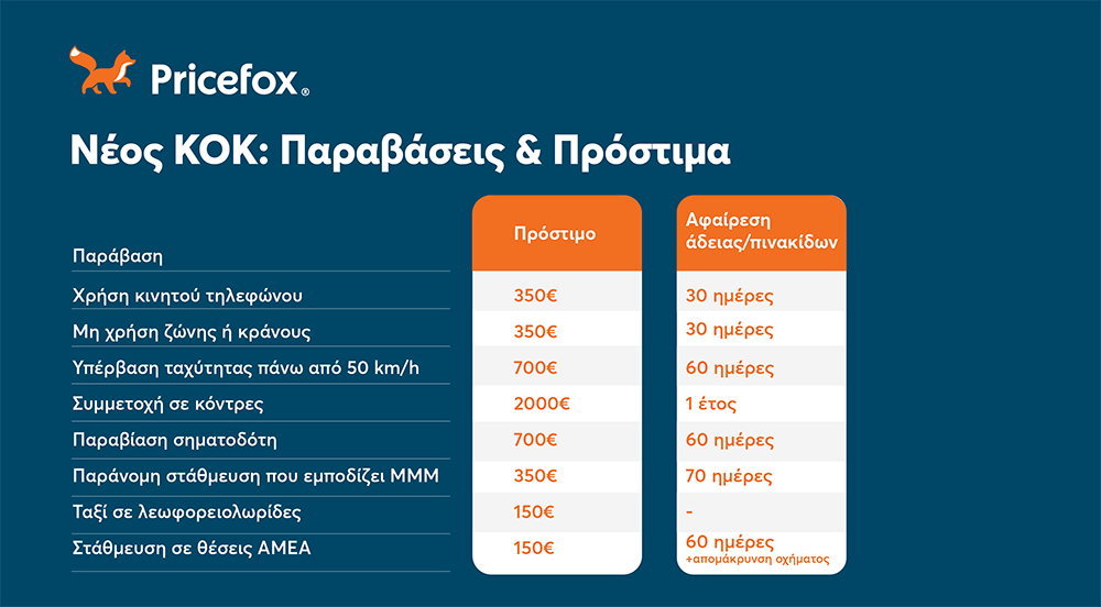 Ο νέος Κώδικας Οδικής Κυκλοφορίας (Ν. 5209/2025) φέρνει σημαντικές αλλαγές με στόχο να μειώσει τα τροχαία ατυχήματα και να αντιμετωπίσει την επικίνδυνη οδήγηση. Το Pricefox.gr, η κορυφαία online πλατφόρμα για σύγκριση και αγορά ασφάλειας αυτοκινήτου, εξηγεί απλά και κατανοητά τις νέες ρυθμίσεις του ΚΟΚ και τα πρόστιμα για τις συχνότερες παραβάσεις.