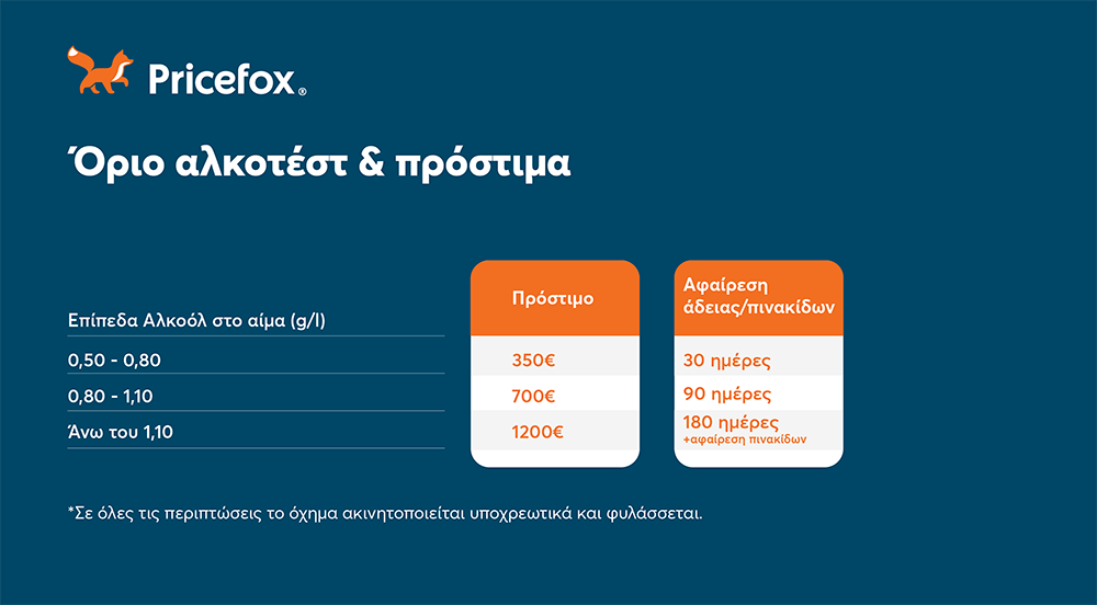 Το πρόστιμο είναι 350€ και αφαιρείται η άδεια για 30 ημέρες. Μετά το πέρας αυτού του διαστήματος, μπορείς να το πάρεις πίσω μόνο αφού πληρώσεις το πρόστιμο.
