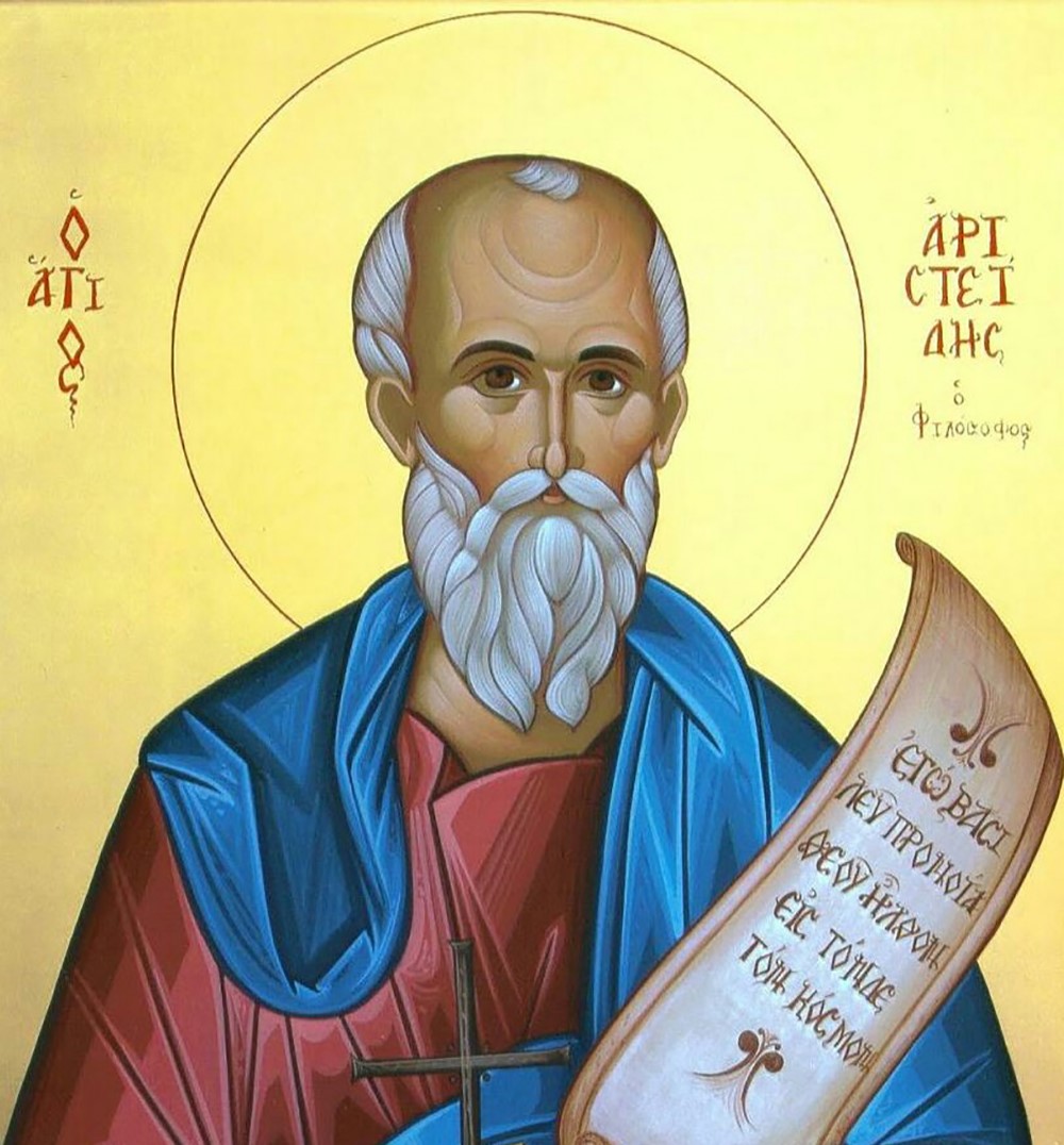 Σύμφωνα με το saint.gr, ο Άγιος Αριστείδης ήταν Αθηναίος ευπατρίδης, φιλόσοφος εξ ενδόξου αθηναϊκού γένους, και έζησε κατά τον 2ο μ.Χ. αιώνα επί αυτοκρατορίας Αδριανού. Έγινε Χριστιανός από τον Άγιο Διονύσιο και τον Άγιο Ιερόθεο και έγραψε στον Αδριανό απολογία υπέρ των διωκόμενων Χριστιανών. Στην συνέχεια εκδιώχθηκε και επειδή έλειπε ο Αδριανός μετέβη στην Ρώμη όπου και απολογήθηκε. Κατόπιν μεταφέρθηκε στην Αθήνα όπου μαρτύρησε, αφού τον κρέμασαν στην αγορά των Αθηνών, την 13η Σεπτεμβρίου του 120 μ.Χ. Ο Ιερώνυμος έγραψε εγκώμιο για τον Άγιο και τον χαρακτηρίζει Ισαπόστολο.