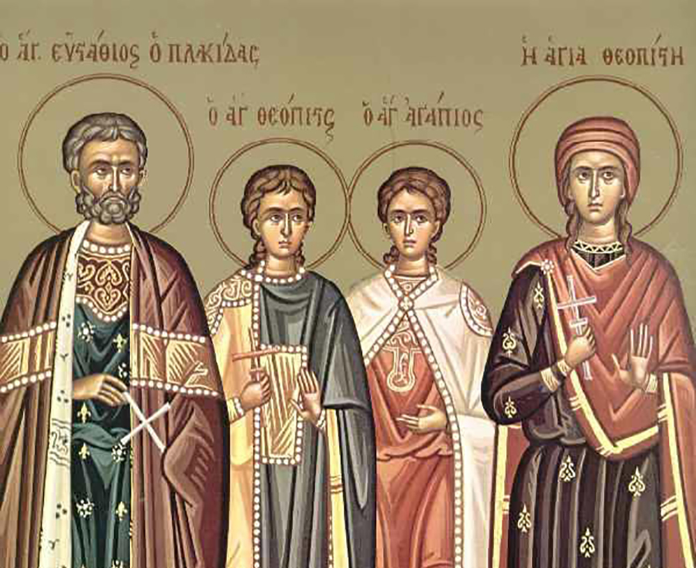 Σήμερα, Σάββατο 20 Σεπτεμβρίου 2025, σύμφωνα με το εορτολόγιο η εκκλησία μας τιμά τη μνήμη του Αγίου Ευσταθίου μεγαλομάρτυρος και της συνοδείας του, Θεοπίστη η σύζυγος του, Αγάπιος και Θεόπιστος τα παιδιά του.