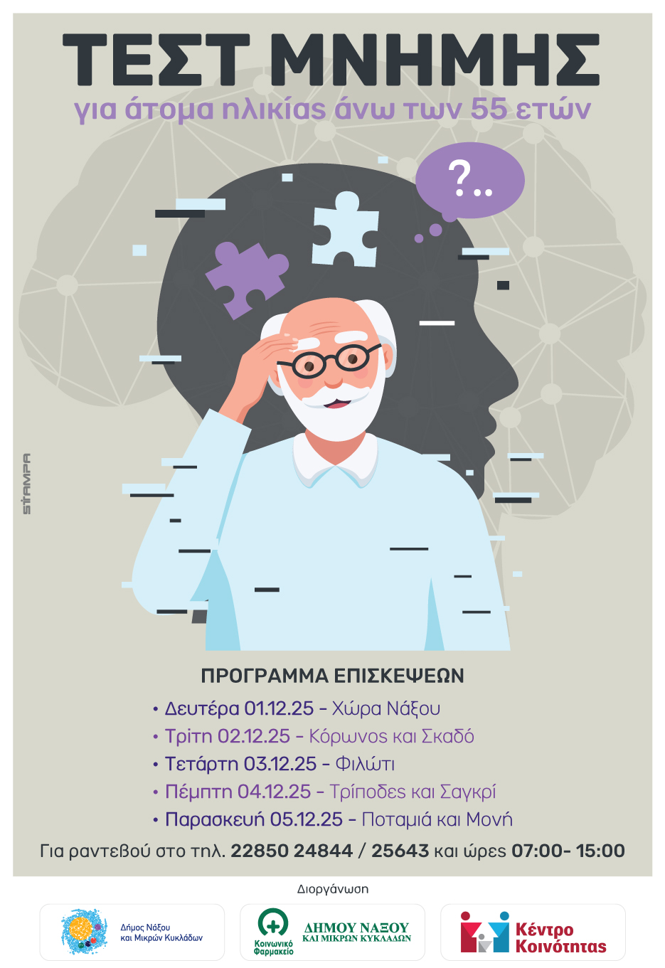 Ο Δήμος Νάξου και Μικρών Κυκλάδων, σε συνεργασία με το Κέντρο Κοινότητας και το Κοινωνικό Φαρμακείο, θα υλοποιήσει δωρεάν Τεστ Μνήμης για άτομα ηλικίας άνω των 55 ετών, με σκοπό την πρόληψη και έγκαιρη ανίχνευση πιθανών γνωστικών δυσκολιών.