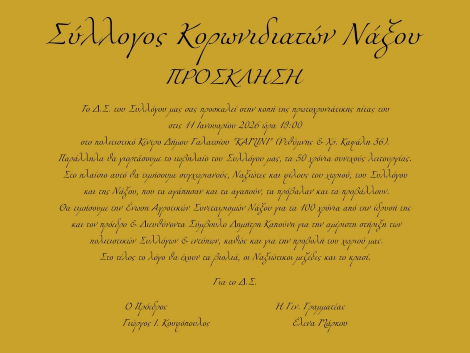 Την κοπή της πρωτοχρονιάτικης πίτας του, σε μια εκδήλωση με ιδιαίτερο συμβολισμό, διοργανώνει ο Σύλλογος Κορωνιδιατών Νάξου, απευθύνοντας ανοιχτή πρόσκληση στα μέλη και τους φίλους του.