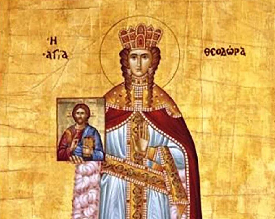 Η Αγία Θεοδώρα, η βασίλισσα, γεννήθηκε στην Έβεσσα της Παφλαγονίας, το 815 μ.Χ., από ευσεβείς γονείς, τον δρουγγάριο Μαρίνο και την ενάρετη Θεοκτίστη που διακρινόταν για την ευλάβειά της και την προσήλωσή της στην ορθόδοξη πίστη. Η Αγία είχε τρεις άλλες αδελφές, τη Σοφία, της Μαρία και την Ειρήνη και δύο αδελφούς, τον Βάρδα και τον Πετρωνά. Το έτος 830 μ.Χ. νυμφεύθηκε τον αυτοκράτορα Θεόφιλο (829 – 842 μ.Χ.), ο οποίος ήταν εικονομάχος. Παρά το εικονομαχικό κλίμα που επικρατούσε, η Θεοδώρα εξακολουθούσε να τιμά τις ιερές εικόνες και να τις φυλάσσει κρυφά στα δώματά της. Η μητέρα της, Θεοκτίστη, εγκατέλειψε τα ανάκτορα και αποσύρθηκε σε γυναικεία μονή, την οποία η ίδια είχε ιδρύσει.