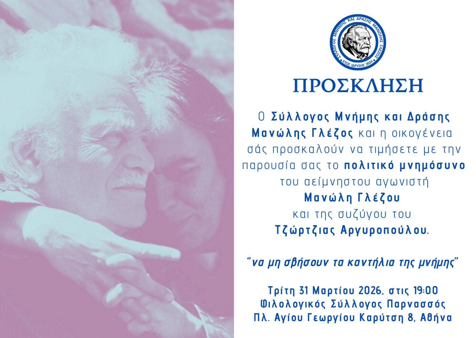 Πολιτικό μνημόσυνο στη μνήμη του αγωνιστή Μανώλη Γλέζου και της συζύγου του Τζώρτζιας Αργυροπούλου θα πραγματοποιηθεί την Τρίτη 31 Μαρτίου 2026, στην Αθήνα.