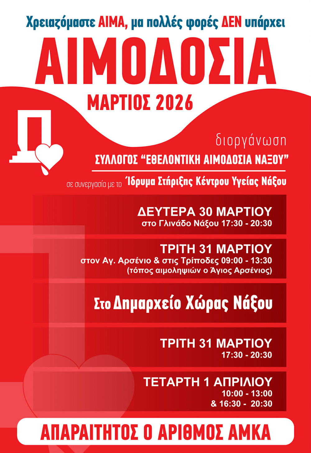 Σε μια ακόμη σημαντική δράση προσφοράς και αλληλεγγύης προχωρά ο Σύλλογος «Εθελοντική Αιμοδοσία Νάξου», διοργανώνοντας αιμοδοσία σε διάφορα σημεία του νησιού από τις 30 Μαρτίου έως και την 1η Απριλίου 2026.