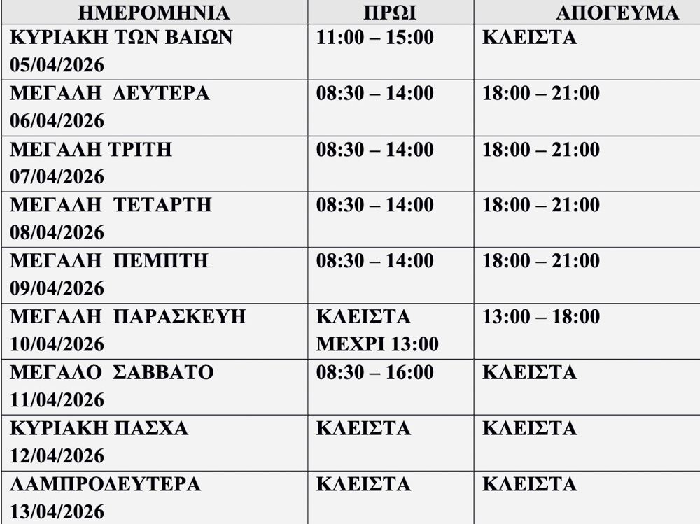 Σύμφωνα με το πρόγραμμα, τα καταστήματα θα λειτουργήσουν με διευρυμένο ωράριο τις καθημερινές, ενώ προβλέπονται αλλαγές τη Μεγάλη Παρασκευή και το Μεγάλο Σάββατο, καθώς και πλήρης αργία την Κυριακή του Πάσχα και τη Δευτέρα.