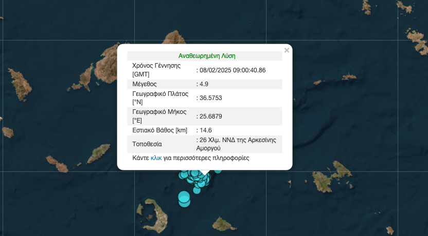 Νέα σεισμική δόνηση μεγέθους 4,9 Ρίχτερ σημειώθηκε στις 11:00 το πρωί, 26 χιλιόμετρα νοτιοδυτικά της Αρκεσίνης Αμοργού, με εστιακό … Συνεχίστε να διαβάζετε το Κυκλάδες: Νέος σεισμός, 4,9 Ρίχτερ 26 χλμ. ΝΝΔ της Αρκεσίνης Αμοργού – Συνεχείς οι σεισμικές δονήσεις.