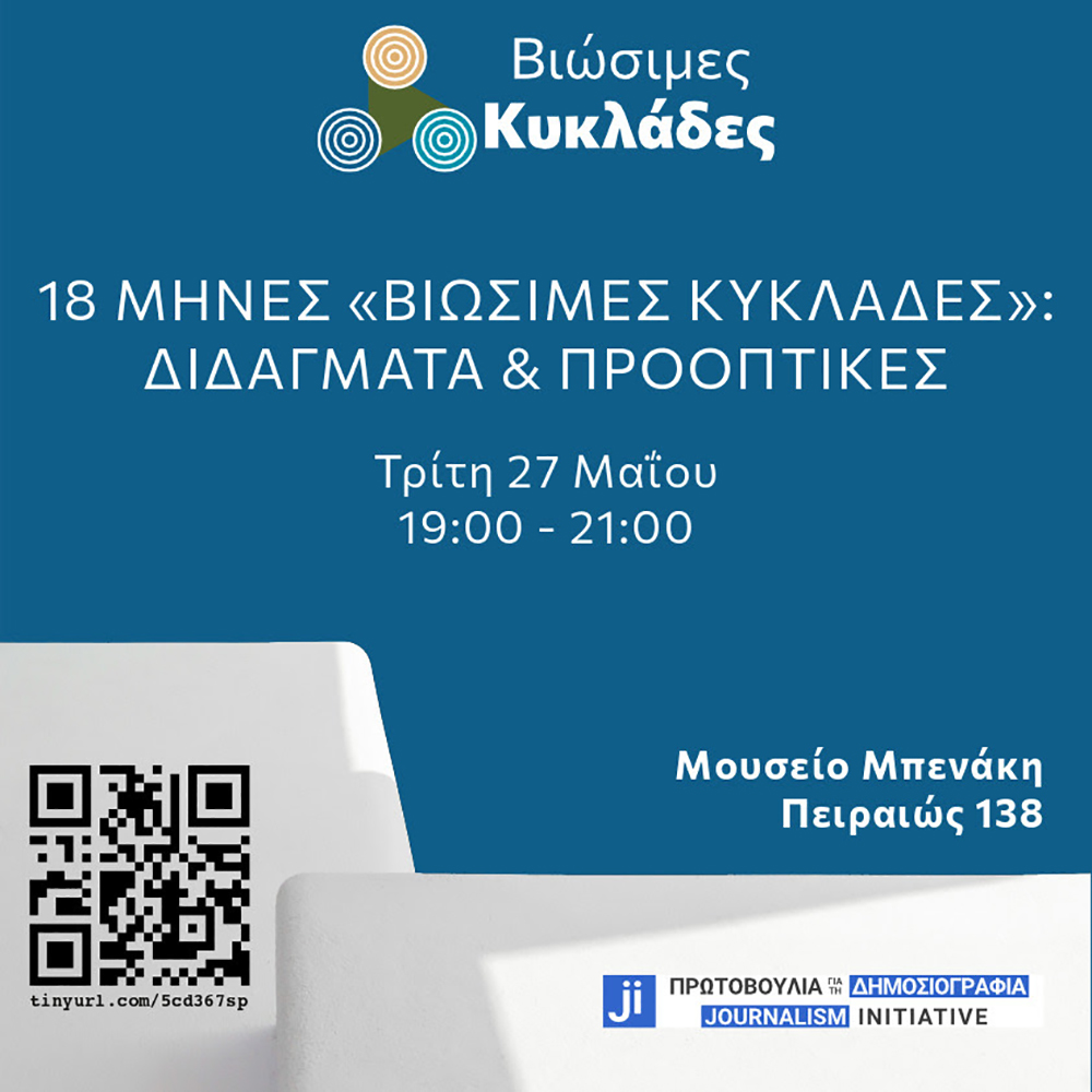 H ΑΜΚΕ «Πρωτοβουλία για τη Δημοσιογραφία» σας προσκαλεί στην τελική εκδήλωση στο πλαίσιο του δημοσιογραφικού εγχειρήματος των «Βιώσιμων Κυκλάδων» για τα διδάγματα που αντλήσαμε από τους 18 μήνες εντατικού ρεπορτάζ και για το τι μπορεί να γίνει από εδώ και στο εξής, δημοσιογραφικά και ευρύτερα, για να διασωθεί η κατάσταση.