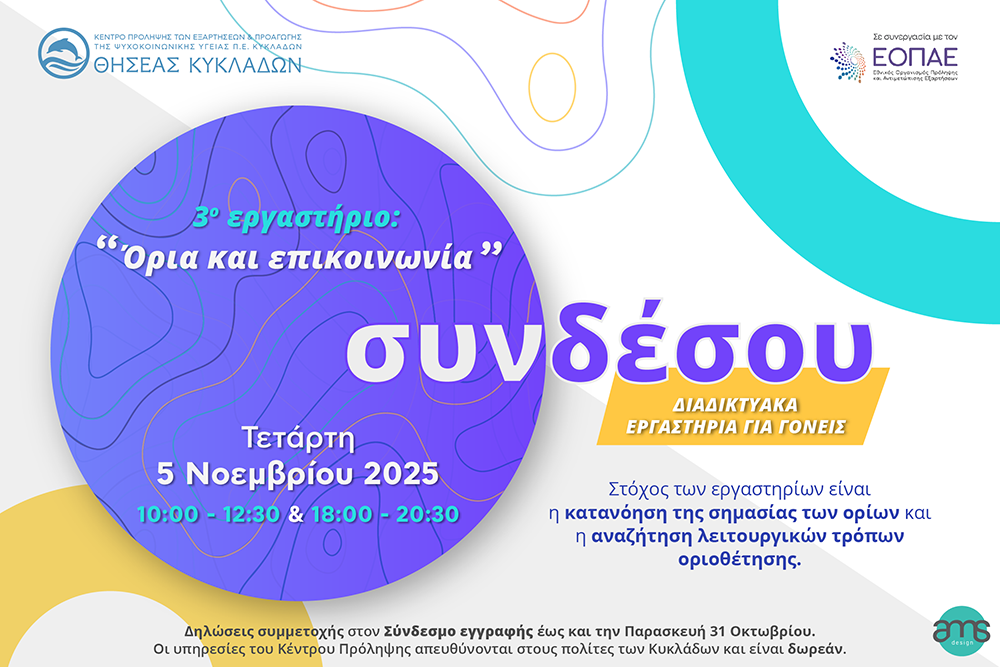 Διαδικτυακό εργαστήριο με θέμα «Όρια και Επικοινωνία» διοργανώνει το Κέντρο Πρόληψης «ΘΗΣΕΑΣ ΚΥΚΛΑΔΩΝ», προσκαλώντας γονείς όλων των νησιών να συμμετέχουν σε αυτό.