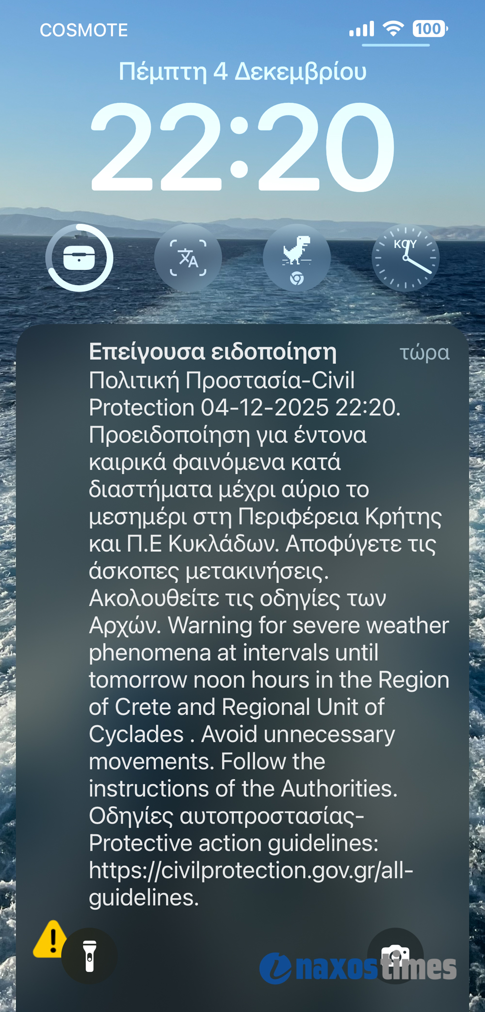 Έκτακτη ειδοποίηση (112) έλαβαν απόψε, στις 22:20, στα κινητά τους οι κάτοικοι της Νάξου και, σύμφωνα με μαρτυρίες, και των άλλων νησιών των Κυκλάδων, από την Πολιτική Προστασία, προειδοποιώντας για επικίνδυνα καιρικά φαινόμενα που θα εκδηλώνονται κατά διαστήματα έως αύριο το μεσημέρι.