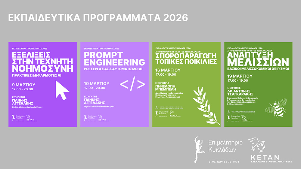 Το Επιμελητήριο Κυκλάδων διοργανώνει από 9 έως 19 Μαρτίου 2026 τέσσερα δωρεάν υβριδικά σεμινάρια (με δυνατότητα διαδικτυακής και δια ζώσης συμμετοχής), απευθυνόμενα σε επιχειρήσεις, εργαζομένους και παραγωγούς των Κυκλάδων. Ο νέος κύκλος καλύπτει σύγχρονες θεματικές στην Τεχνητή Νοημοσύνη και την επιχειρηματικότητα, καθώς και την ανάδειξη και αξιοποίηση του αγροδιατροφικού πλούτου των νησιών, με στόχο την ενίσχυση των παραγωγικών δυνάμεων του πρωτογενούς τομέα και τη συνεχή επιμόρφωση των μελών του.