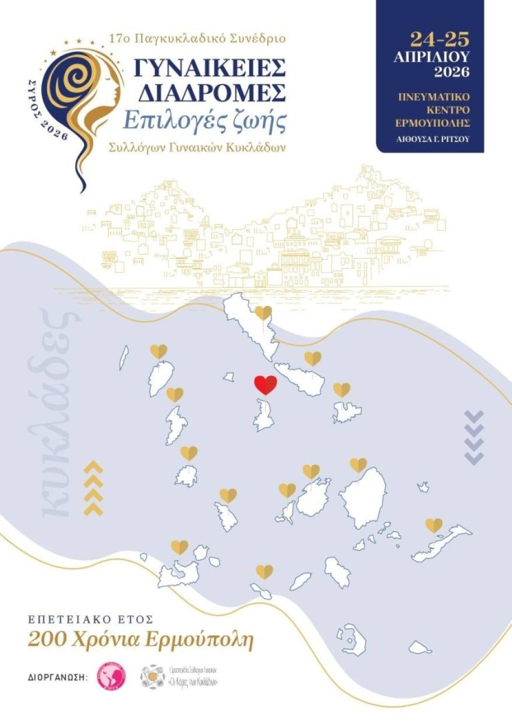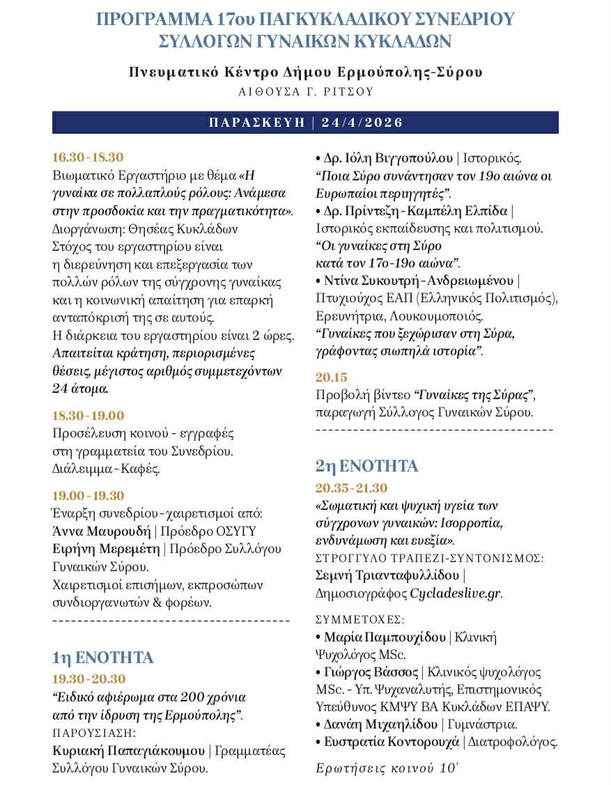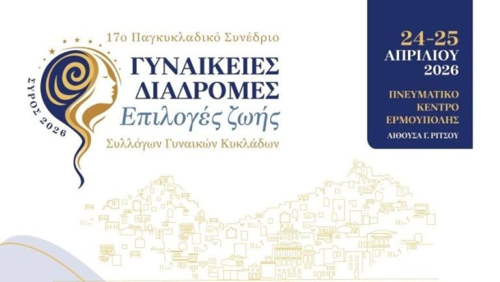 Η Ομοσπονδία Συλλόγων Γυναικών Κυκλάδων (ΟΣΥΓΥ) – Οι Κόρες Των Κυκλάδων σε συνεργασία με τον Σύλλογο Γυναικών Σύρου διοργανώνουν το 17ο Παγκυκλαδικό Συνέδριο Συλλόγων Γυναικών Κυκλάδων (Σύρος, 24-25 Απριλίου 2026) ανοίγοντας έναν εποικοδομητικό διάλογο για όλες τις γυναίκες.