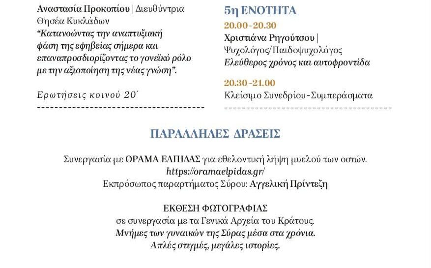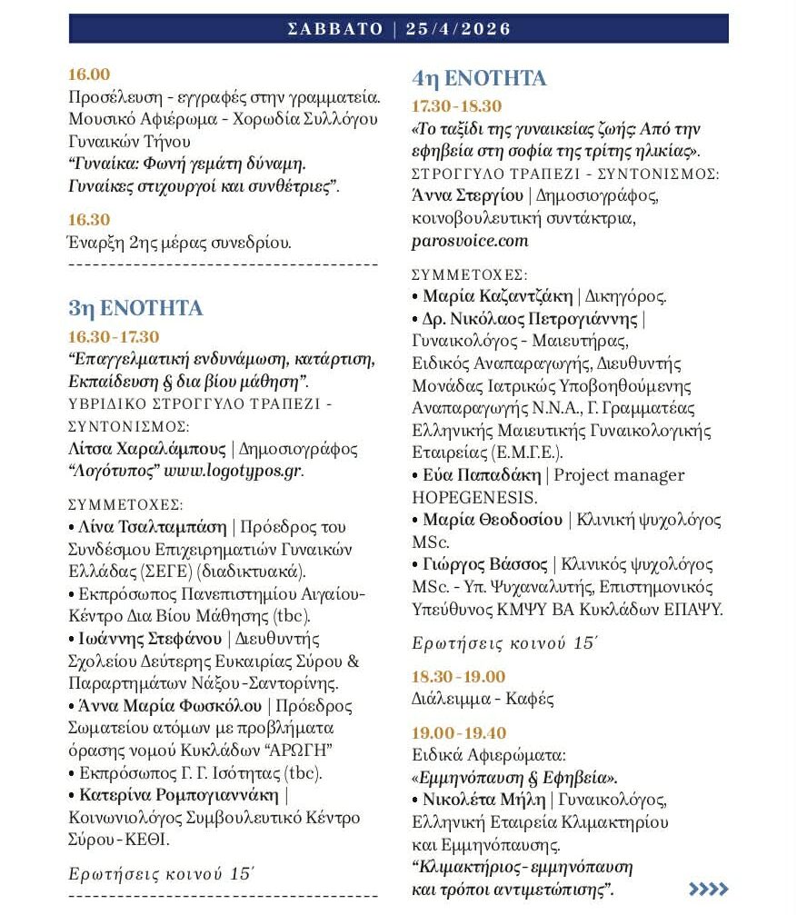 Το φετινό συνέδριο με θέμα «Γυναικείες διαδρομές – Επιλογές ζωής: υγεία, επάγγελμα, οικογένεια, σεξουαλικότητα, ελεύθερος χρόνος» δίνει βήμα “στις γυναίκες που κουβαλούν μνήμες, εμπειρία και ιστορίες ζωής, στις νέες που αναζητούν τον δρόμο τους, στις εργαζόμενες και τις μητέρες και σε κάθε γυναίκα που έχει ανάγκη να ακουστεί”. Μέσα από εισηγήσεις, παρεμβάσεις και ανοιχτές συζητήσεις, οι γυναίκες των Κυκλάδων θα μιλήσουν για όσα τις απασχολούν σήμερα, αναζητώντας παράλληλα απαντήσεις και προοπτικές για το αύριο.