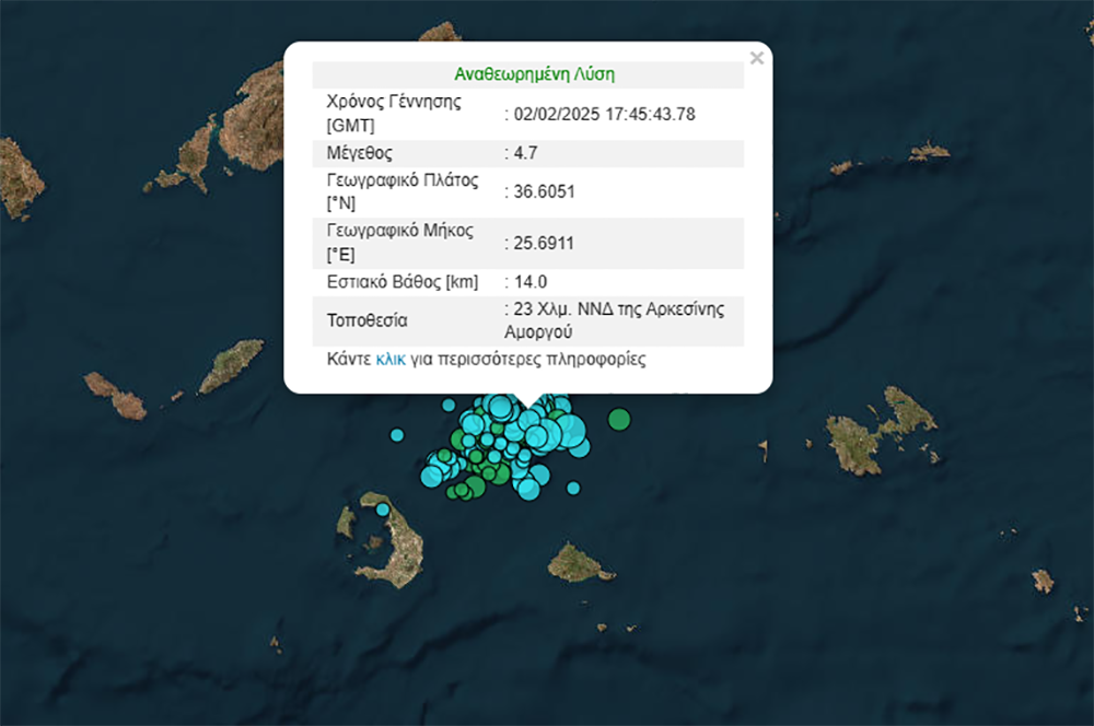Το σεισμολογικό δίκτυο κατέγραψε στις 19:45 ασθενή σεισμική δόνηση με μέγεθος 4.7 στην κλίμακα Ρίχτερ. Ο σεισμός έγινε σε απόσταση 230 χλμ. ΝΑ των Αθηνών με το επίκεντρο της δόνησης να εντοπίζεται στο θαλάσσιο χώρο 22 χλμ. ΝΝΔ της Αρκεσίνης Αμοργού.