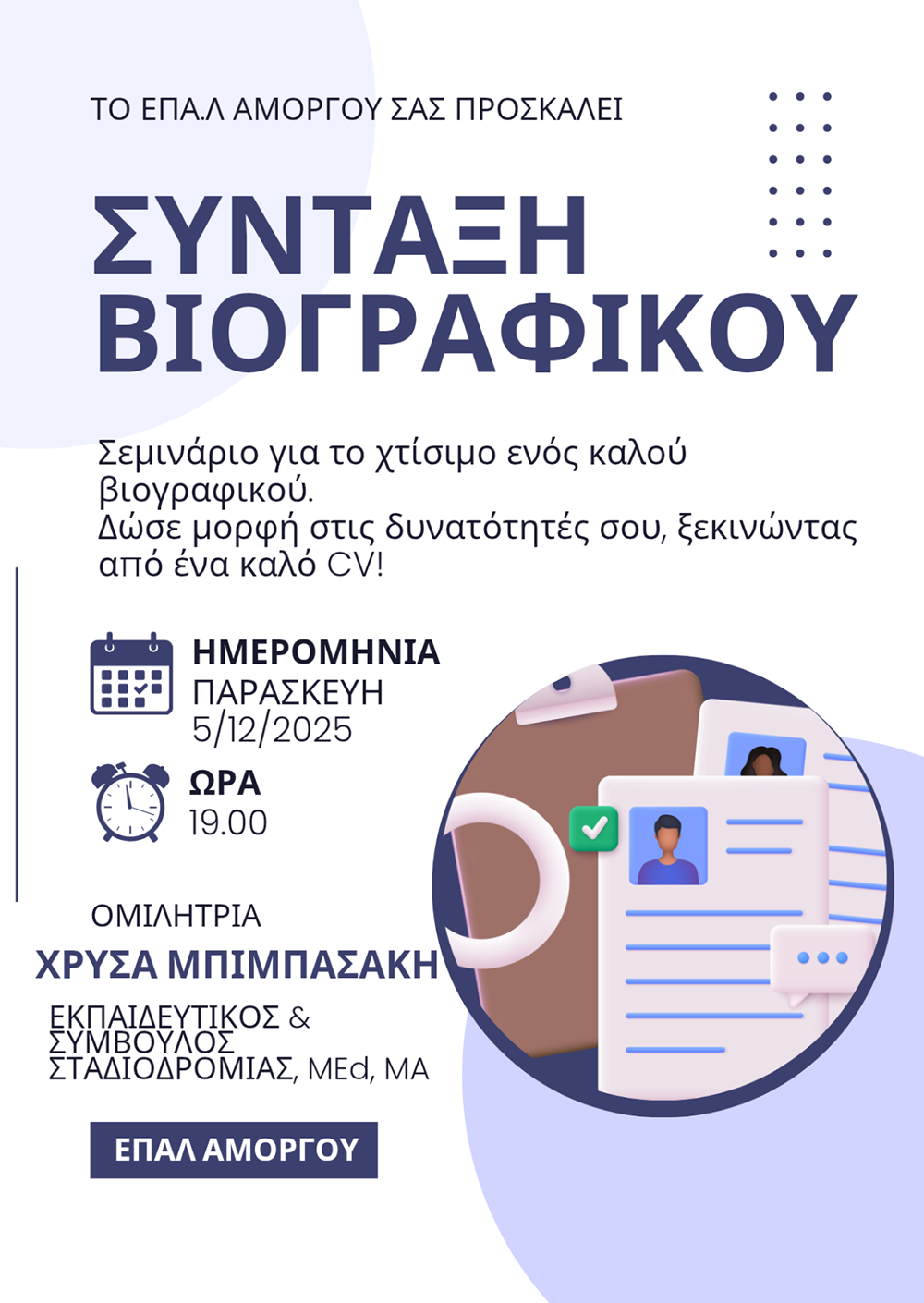 Σας ενημερώνουμε ότι την Παρασκευή 05-12-25 και ώρα 19:00, στο χώρο του ΕΠΑΛ, θα πραγματοποιηθεί σεμινάριο, ανοιχτό στο κοινό της Αμοργού, με θέμα ”Τεχνικές αναζήτησης εργασίας: Σύνταξη βιογραφικού”, από την Εκπαιδευτικό και Σύμβουλο Σταδιοδρομίας, MEd, MA κ. Χρύσα Μπιμπασάκη.