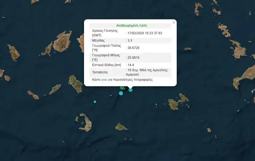 Σεισμός μεγέθους 3,3 βαθμών της κλίμακας Ρίχτερ σημειώθηκε στις Κυκλάδες στη θαλάσσια περιοχή ανάμεσα στη Σαντορίνη και Αμοργό στις 5:25 το απόγευμα της Τρίτης (17.02.2026).