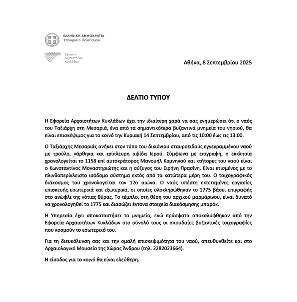 Η Εφορεία Αρχαιοτήτων Κυκλάδων έχει την ιδιαίτερη χαρά να σας ενημερώσει ότι ο ναός του Ταξιάρχη στη Μεσαριά, ένα από τα σημαντικότερα βυζαντινά μνημεία του νησιού, θα είναι επισκέψιμος για το κοινό την Κυριακή 14 Σεπτεμβρίου, από τις 10:00 έως τις 13:00.