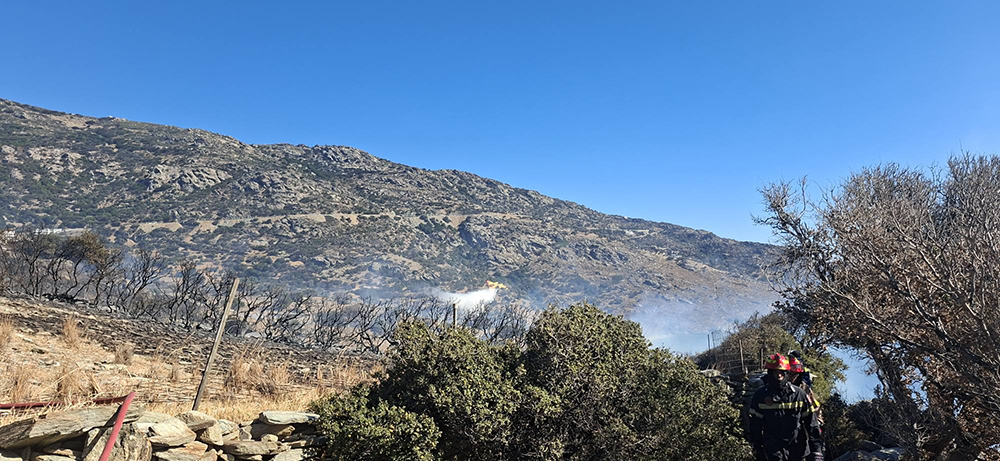 Συνεχίζει το καταστροφικός της έργο η φωτιά που εκδηλώθηκε σήμερα το μεσημέρι σε αγροτοδασική έκταση στην Παλαιόπολη Άνδρου
