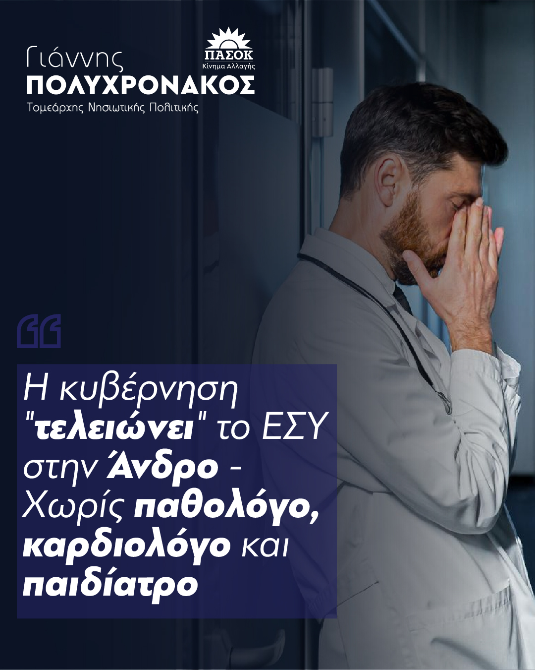 Στην οριακή κατάσταση λειτουργίας του Κέντρου Υγείας Άνδρου αναφέρεται με δημόσια παρέμβασή του ο τομεάρχης Νησιωτικής Πολιτικής του ΠΑΣΟΚ – Κινήματος Αλλαγής, Γιάννης Πολυχρονάκος, επισημαίνοντας σοβαρές ελλείψεις σε βασικές ιατρικές ειδικότητες.