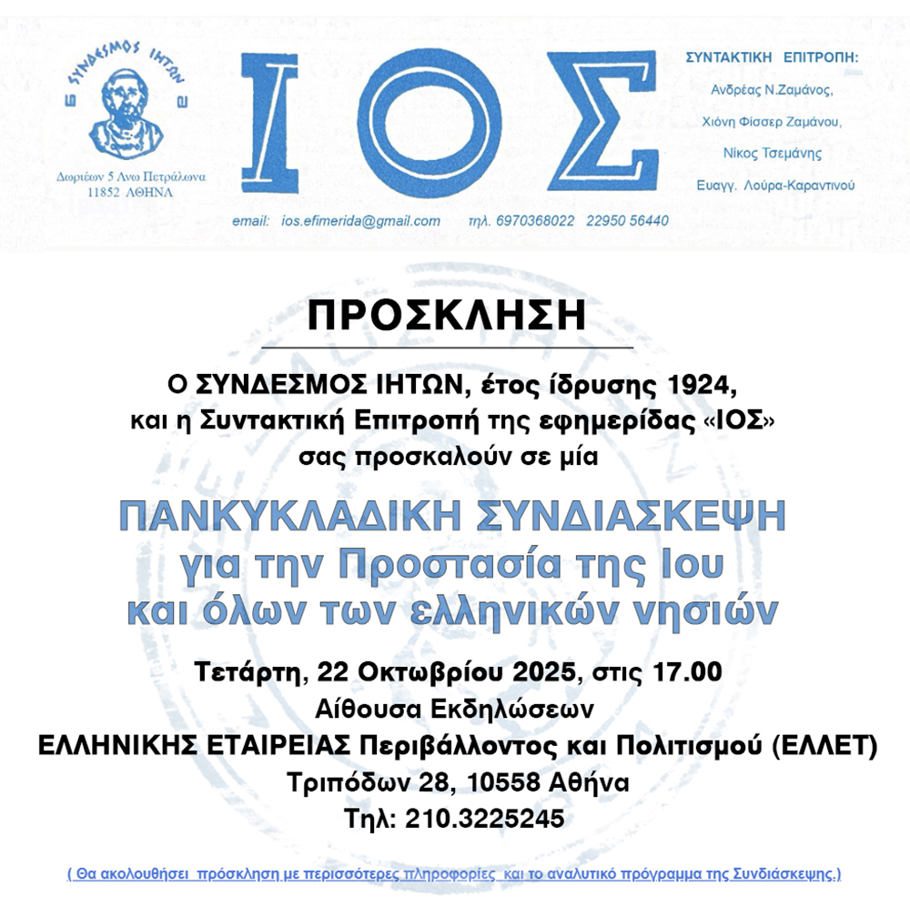 Ο Σύνδεσμος Ιητών, με έτος ίδρυσης το 1924, και η Συντακτική Επιτροπή της εφημερίδας «ΙΟΣ», διοργανώνουν Πανκυκλαδική συνδιάσκεψη για την Προστασία της Ίου και όλων των ελληνικών νησιών την Τετάρτη 22 Οκτωβρίου 2025, στις 17:00, στην Αίθουσα Εκδηλώσεων της Ελληνικής Εταιρείας Περιβάλλοντος και Πολιτισμού (ΕΛΛΕΤ), στην Αθήνα (Τριπόδων 28, Πλάκα).